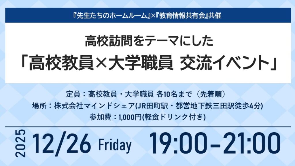 【対面型】2025年12月26日(金)19時~高校訪問をテーマにした「高校教員×大学職員交流イベント」開催のお知らせ