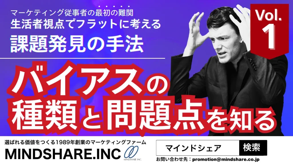 創業38年で上場企業を含む2,400社以上のマーケティング支援実績を有する株式会社マインドシェア(東京都港区)は、マーケティング従事者が躓く課題をテーマにしたセミナー「生活者視点でフラットに考える課題発見の手法〜vol.1 バイアスの種類と問題点を知る」を2026年3月29日(日)まで期間限定で一般無料公開することを決定し、現在公開中。
